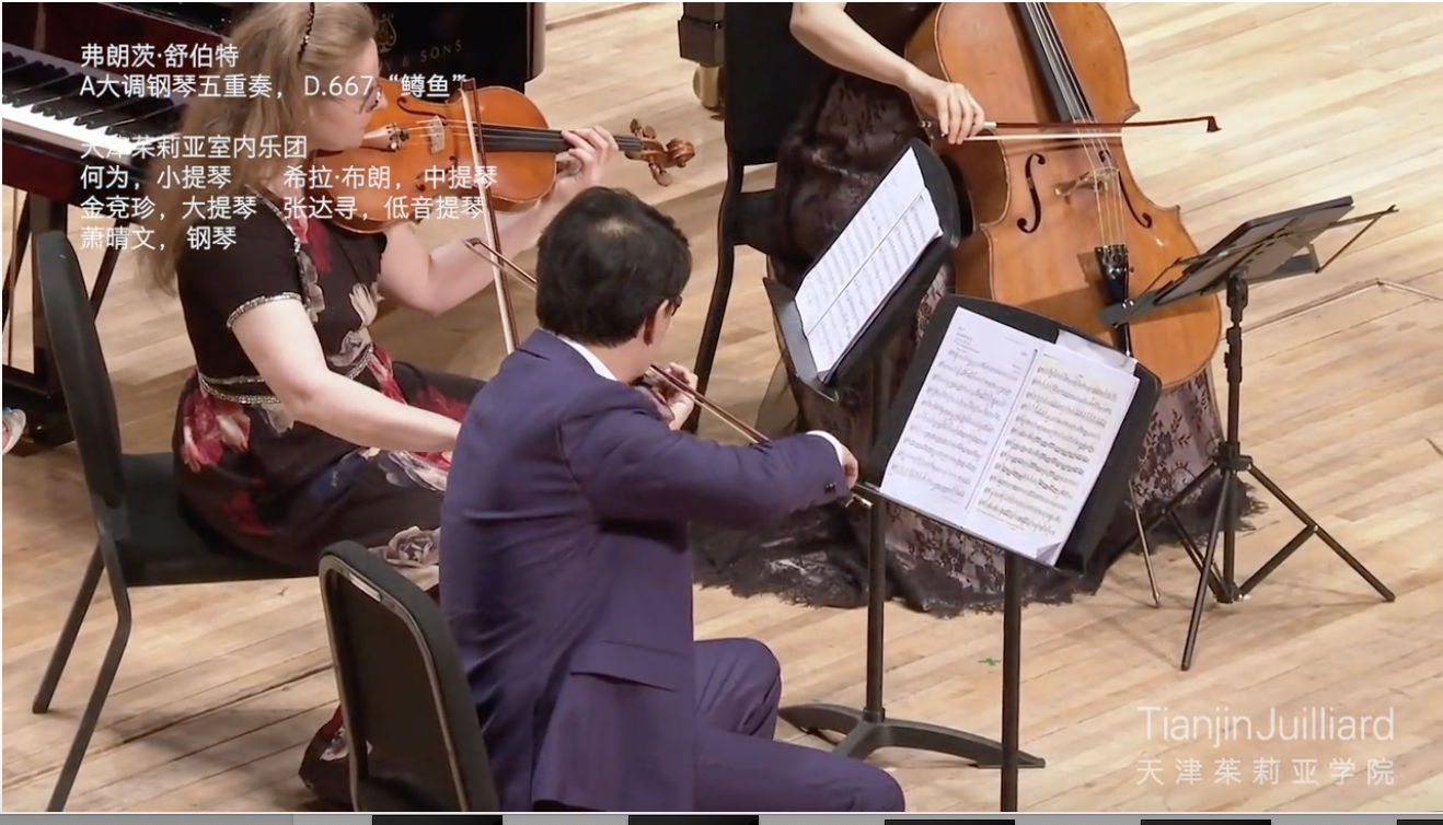 ...弗朗茨·舒伯特A大调钢琴五重奏,D.667,“鳟鱼”生气勃勃的快板行板谐谑曲:急板主题与变奏:小行板终曲:严格快板何为,小提琴希拉·布朗,中提琴金兗珍,大提琴张达寻,低音提琴萧晴文,钢琴...